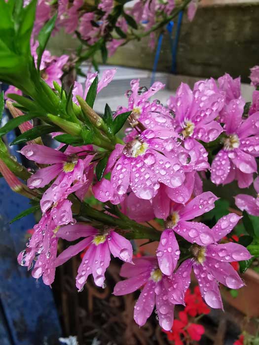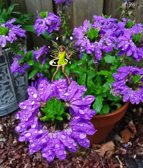 Blue-Elf entourée des éventails des fées. Des annuelles magnifiques au port retombant.